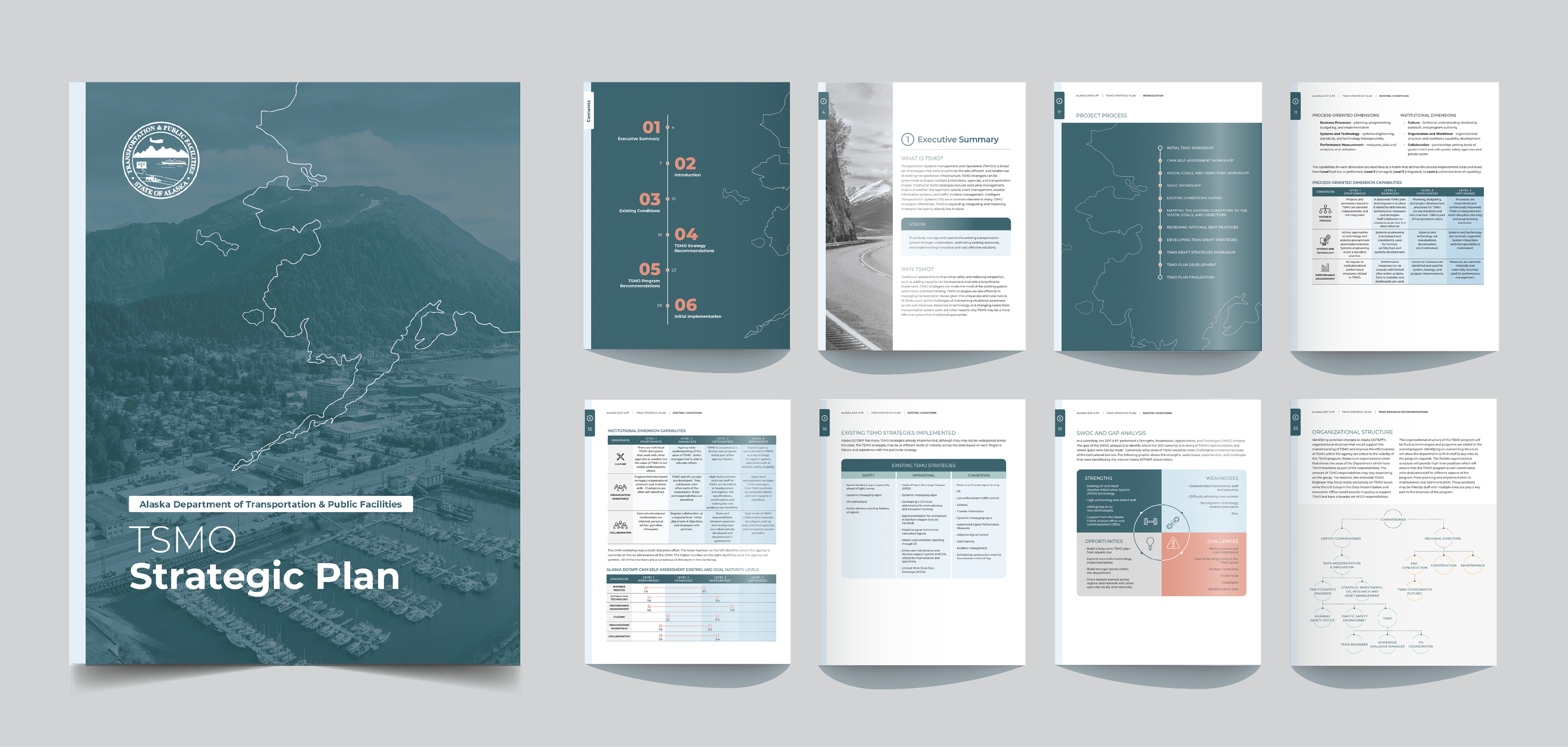 Commissioned by the Alaska Department of Transportation to design their Transportation Systems Management and Operations (TSMO) Plan, the design of the document incorporates Alaska's beautifully unique geography and identity, displayed in a muted color palette.