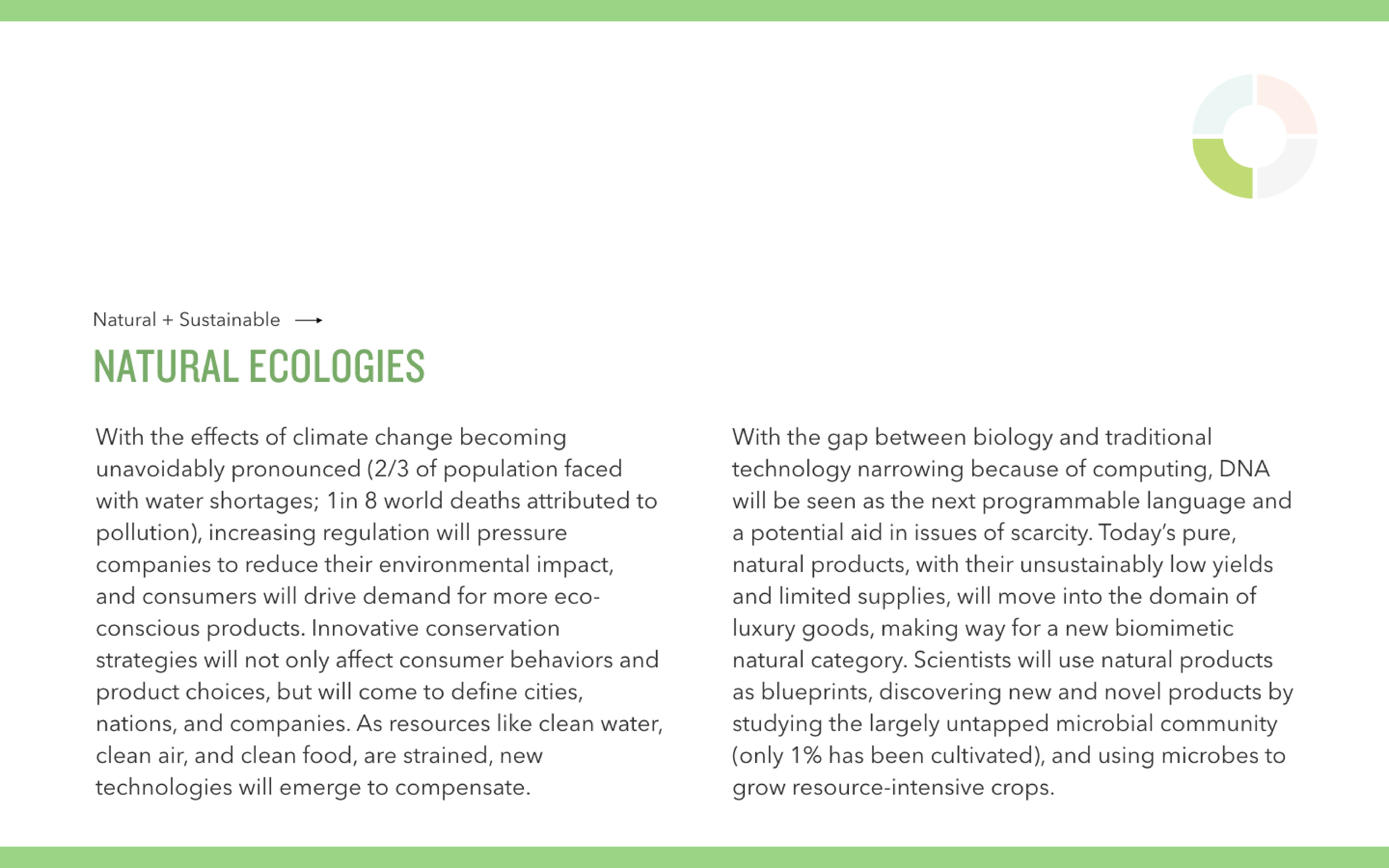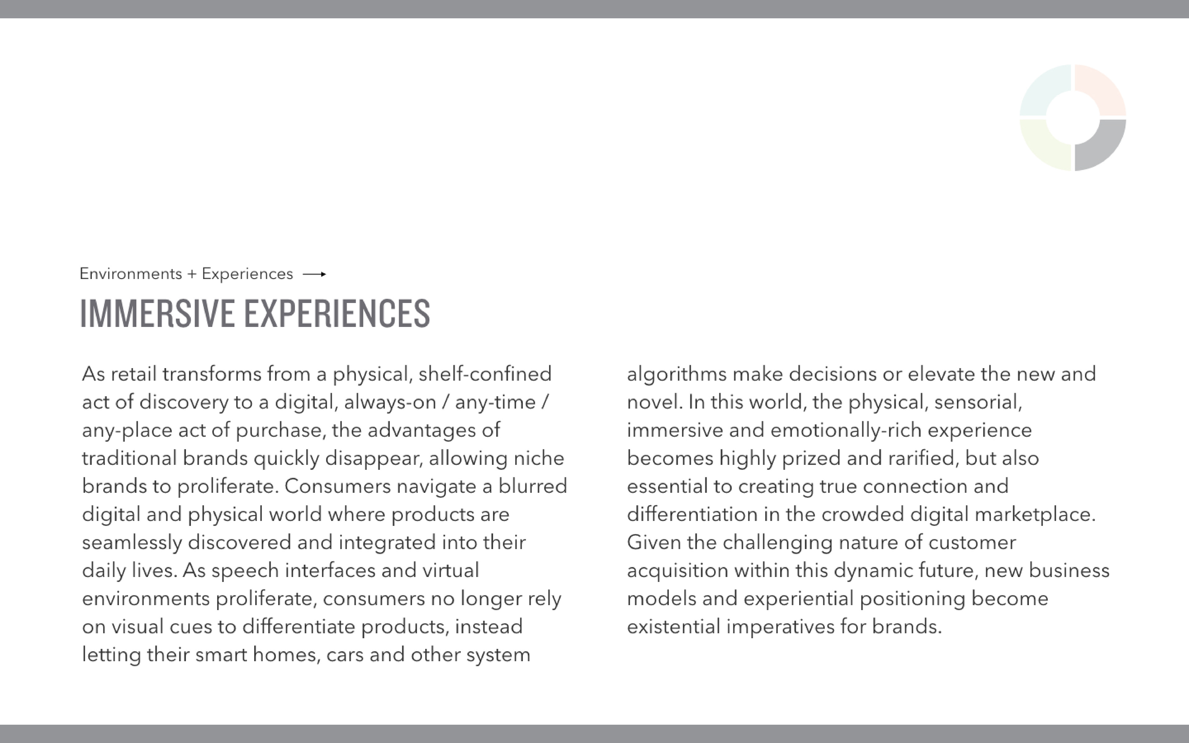 We conducted research over the course of two months, assessing P&G's global brand presence, and dovetailing the findings with current and upcoming trends in the global market. We distilled the analysis into four areas of focus: environments and experiences, nature and sustainability, emerging biointelligence, and innovative manufacturing.