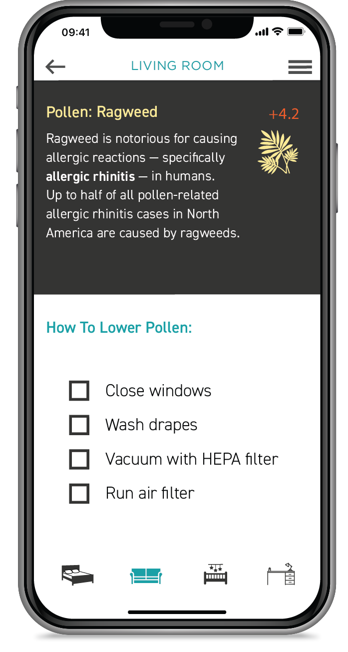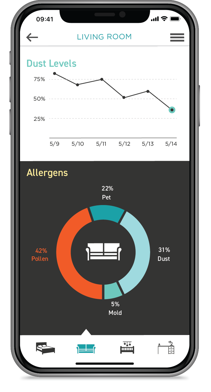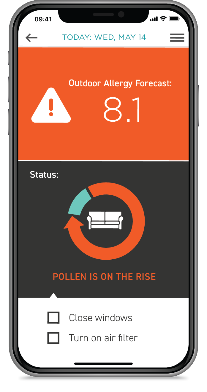 User interface design for Logitech’s HealthyHome Allergy + Asthma app. Designed mobile app UI to link the HealthyHome smart system to monitor dust and allergen levels within and outside the home, track symptoms, view allergen forecasts and information, and provide smart tips based on user learning.